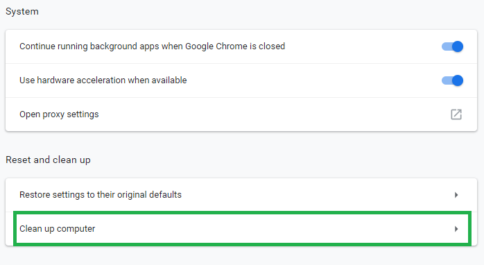 Advanced settings expander - Scroll to the “Reset and Cleanup” section and click on the “Clean up computer” option