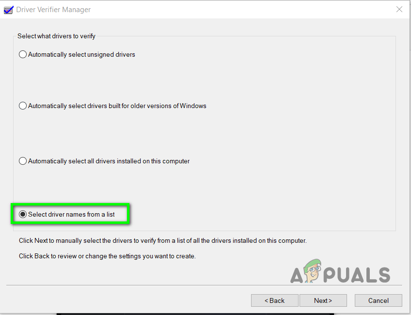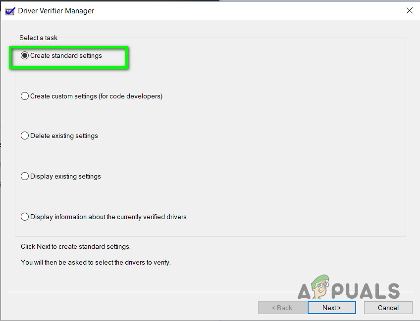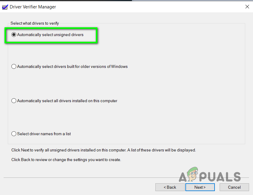 Automatically select unsigned drivers - Now close the Driver Verifier Manager and open it again and click the option Create Standard Settings and click Next