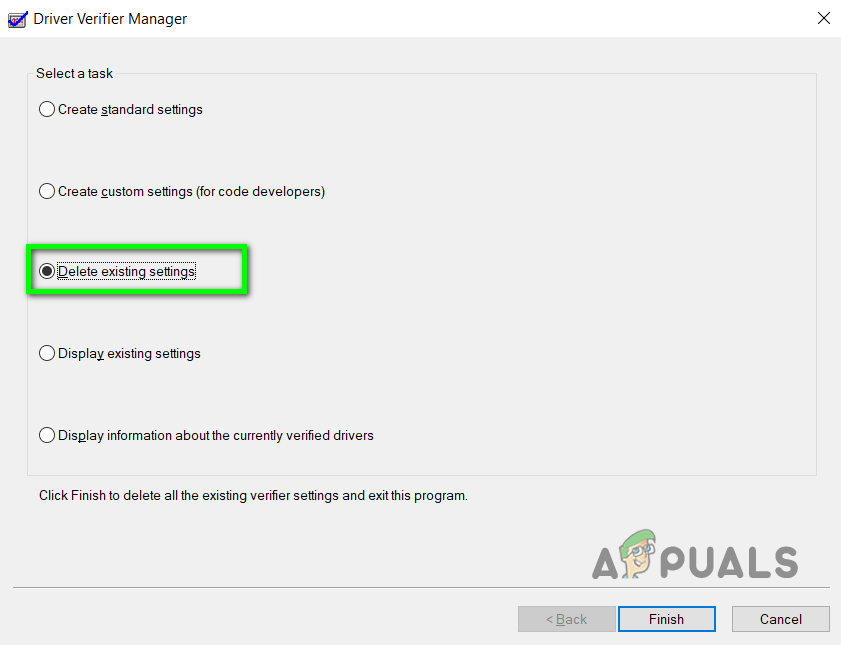 Select all the drivers that show the Provider as unknown - You will be prompted to restart your computer. Once you restart reopen the Driver Verifier and choose the option Delete existing Settings and Click Finish.