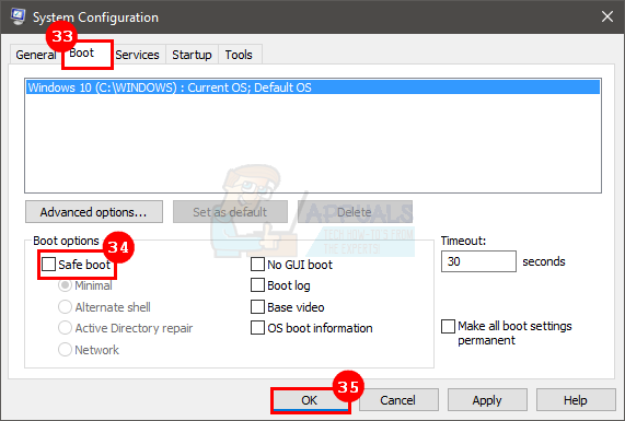 - Uncheck the option Safe Boot in the Boot options section
