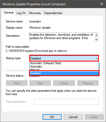 - Select Disabled from the drop down menu in Startup Type