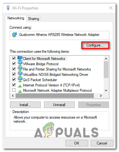 Accessing the Network Adapter Properties - On your Network Adapter status screen, click on Properties. Then, from the Properties screen, go to the Networking tab and click on Configure under your active wireless adapter.