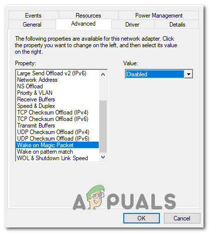 Accessing the Network’s adapter’s properties - Inside the Properties screen of your Network adapter, go to the Advanced tab and scroll down to Wake on Magic Packet. With the property selected, change its value from the right to Disabled.