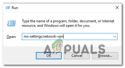 - Press Window key + R to open up a Run dialog box. Then, type “ms-settings:network-vpn” and press Enter to open up the VPN tab of the Settings tab.