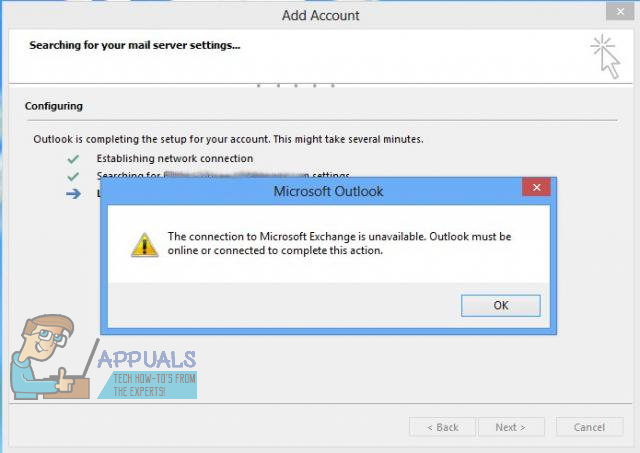 Described below is the error message that countless Outlook users have reported seeing when they either launch Outlook or try to configure Outlook on their computers for the very first time. The error message has an OK button that can be clicked on to dismiss it, but clicking on OK simply leads to a dialog box popping up asking for the user’s Microsoft Exchange server and User Name, but typing in the credentials and clicking on Next doesn’t work either.