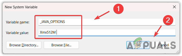 - Set Variable name to _JAVA_OPTIONS and Variable value to Xmx512M, then click OK.