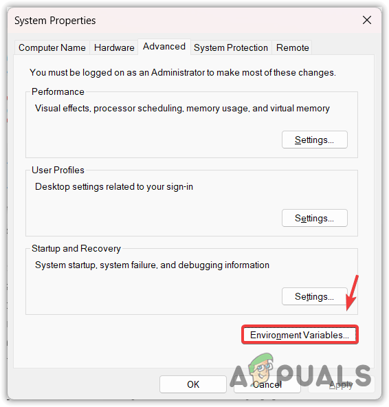 - In System Properties, go to the Advanced tab and click Environment Variables.