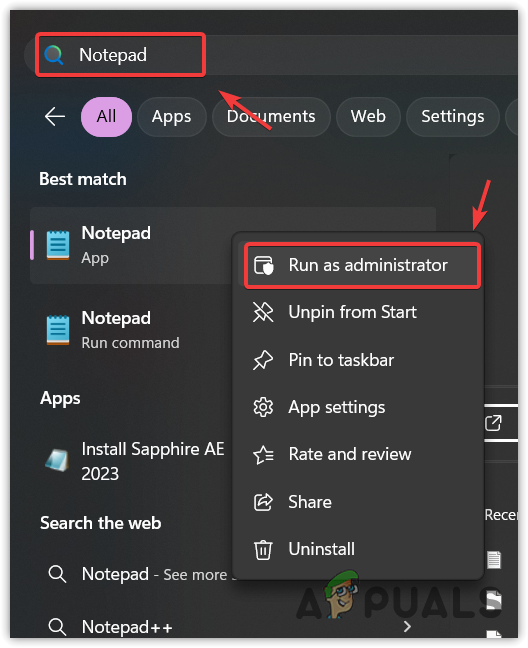 - Right-click Notepad and select Run as administrator.
