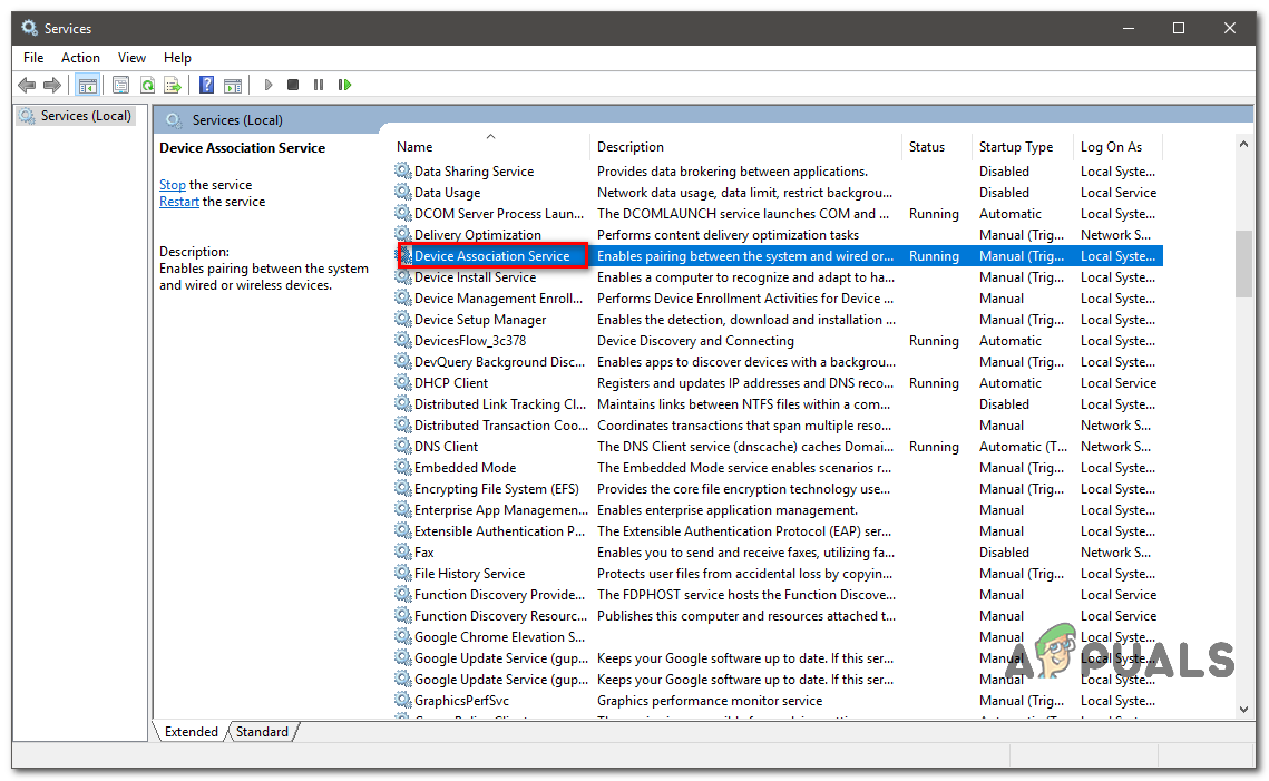 Opening Services.msc - Once the Services.msc is opened find the service named “Device Association Service”
