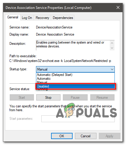 - Now press the drop-down menu under “Startup Type” and select “Disabled”