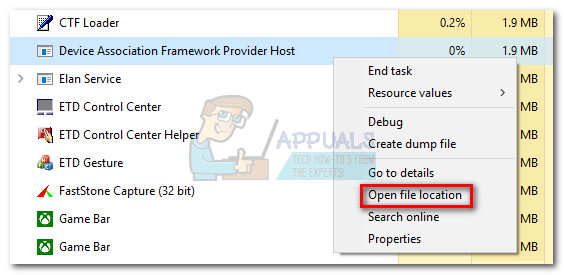 But if you’d like to be absolutely sure, a quick and effective way to determine if the Device Association Framework Provider Host process is legit is by checking it’s underlying file location. You can do this easily by opening Task Manager (Ctrl + Shift + Esc), right clicking on Device Association Framework Provider Host and choosing Open File Location.