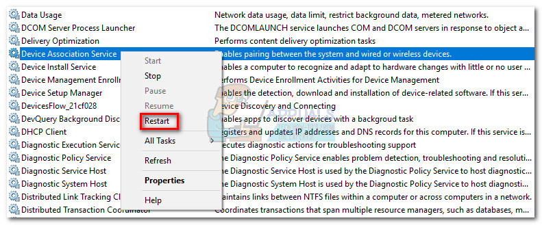 A more in-depth solution would be to restart the Device Association Service from the Services window and remove the glitch. To do this, open a Run window (Windows key + R), type “services.msc” and hit Enter. In the Services dialog box, look for the Device Association Service entry. Once you found it, right-click on it and choose Restart.