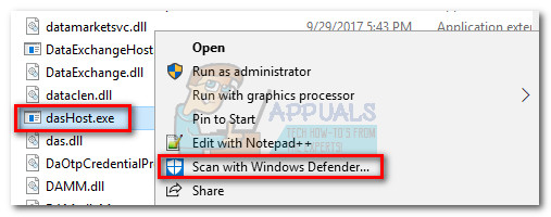 If the executable is located in Windows / System32, you can probably rest assured as you’re not dealing with a camouflaged malware. In the event that you’re still skeptical, you can also trigger a virus scan on the process by right-clicking on DasHost.exe and choosing Scan with Windows Defender.