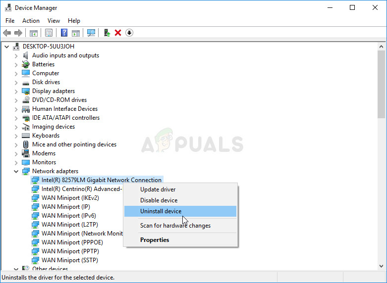 - Expand the “Network Adapters” section. This will display all network adapters that the machine has installed at the moment. Right click on the network adapter you want to uninstall and select “Uninstall device”. Choose the one corresponding to your active Internet connection. This will remove the adapter from the list and uninstall the networking device. Make sure you choose the right one depending of which type of connection is giving you these issues.