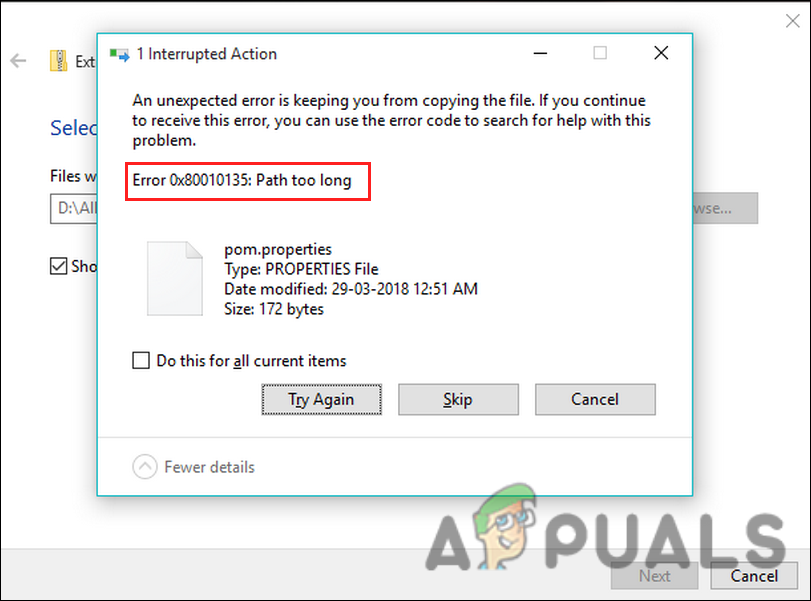 The error 0x80010135 appears typically when you enter a file name that is more than 260 characters in the File Explorer or WinZip. In some cases, however, it can also be caused due to incomplete installation of the targeted software.