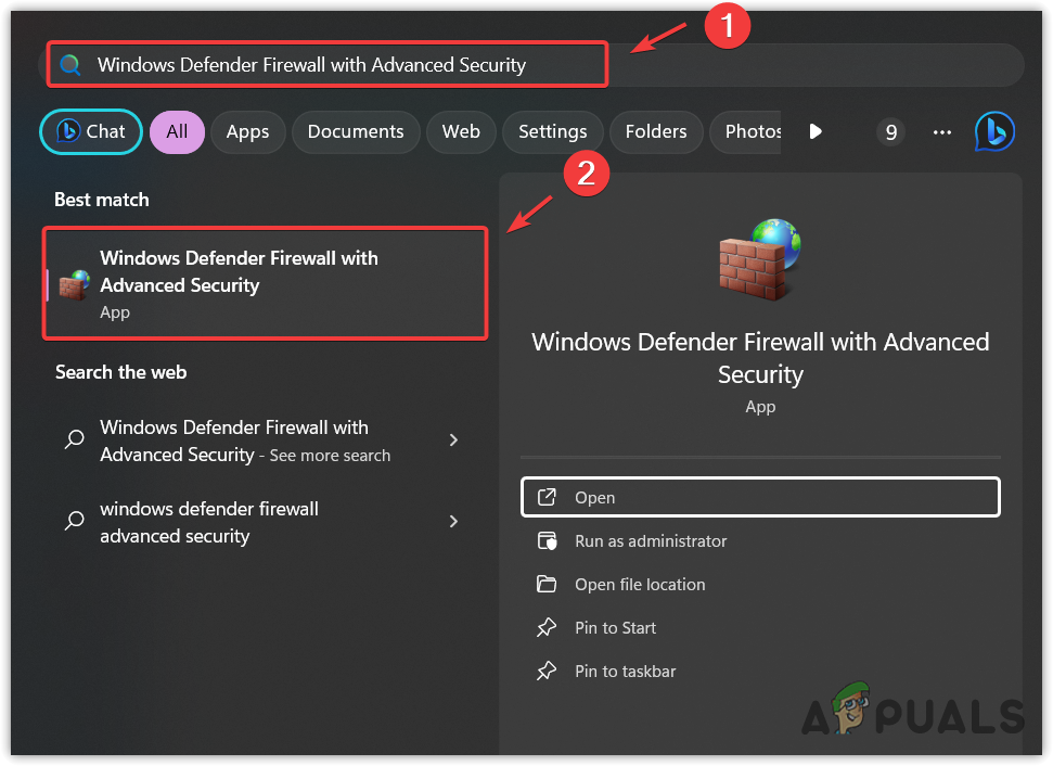 - Open the Start Menu and type Windows Defender Firewall with Advanced Security.