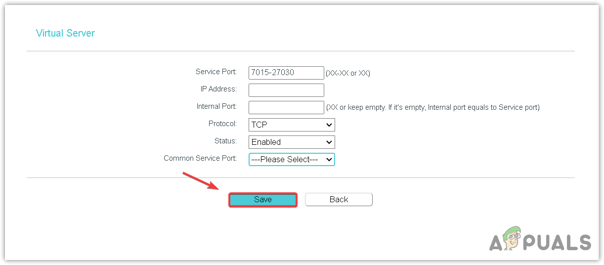 - Choose Add New and enter 27015-27030 in the Service Port fields. You might see them labeled as Internal and External ports. Input 27015 as the internal port and 27030 as the external port if required. If only one internal port option is present, enter 27015-27030 there.