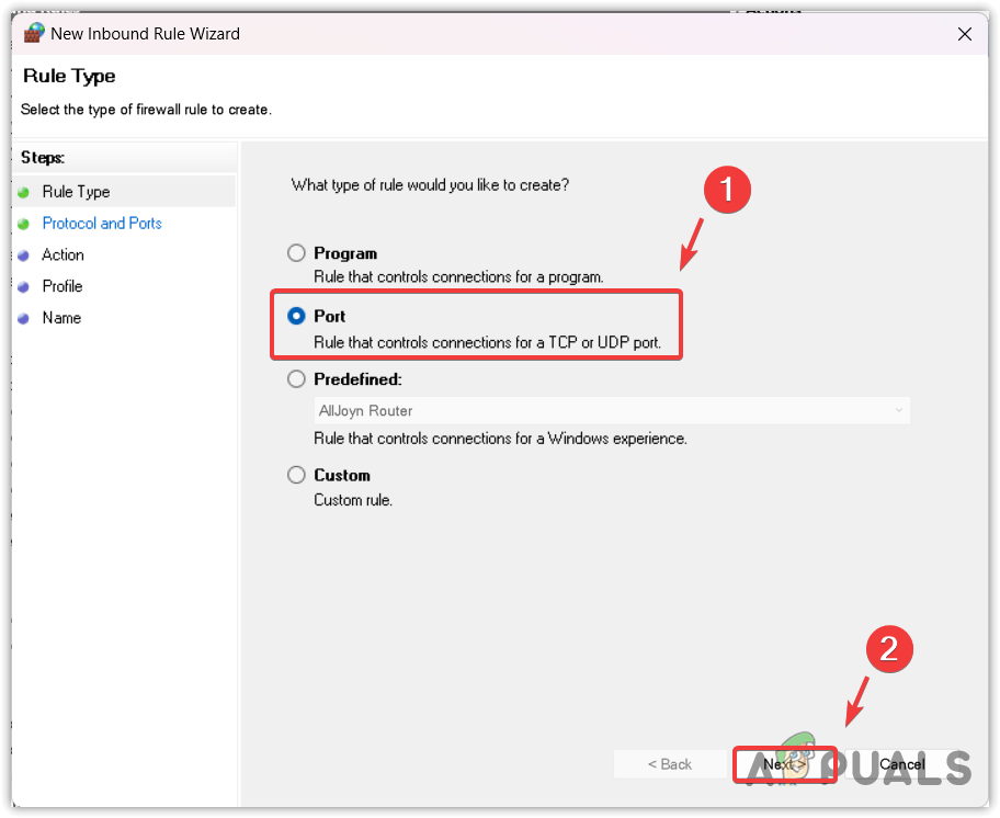 - Create another New Rule, choosing Port, and then continue by clicking Next.