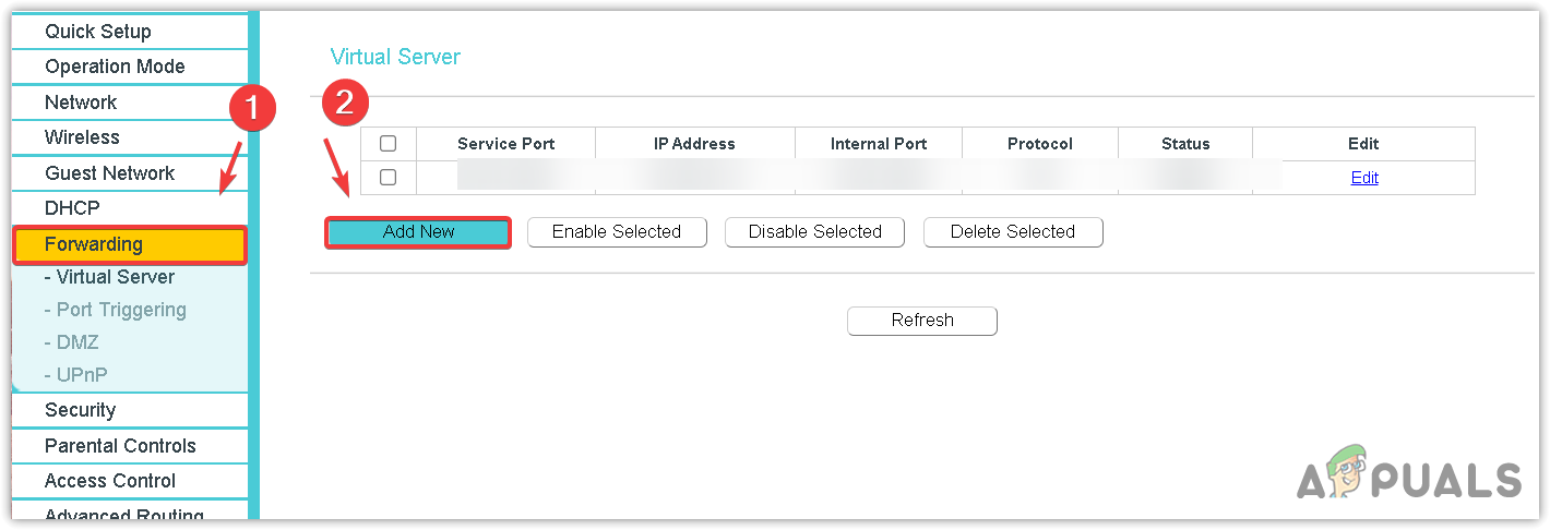 - Locate the Port Forwarding, Forwarding, or Virtual Server option and enter it. Click Add New.