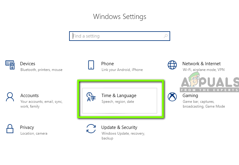 - Press Windows + S to launch the search bar. Type “settings” in the dialogue box and open the result. Now click on Time & Language.
