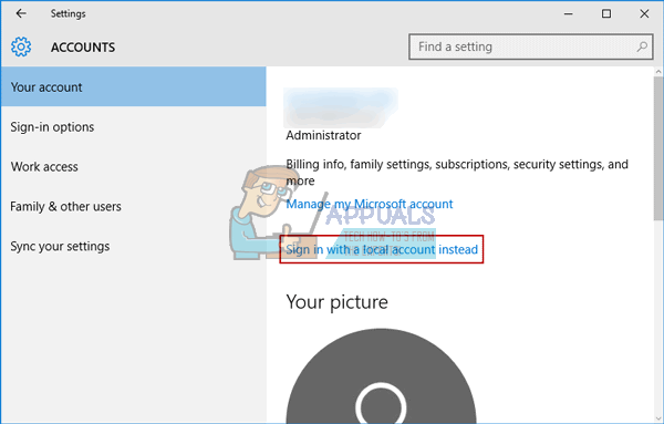 - Under the Your account submenu, click on Sign in with a local account instead. If you are already using a local account, a different option would appear, saying “Sign in with a Microsoft account instead”.