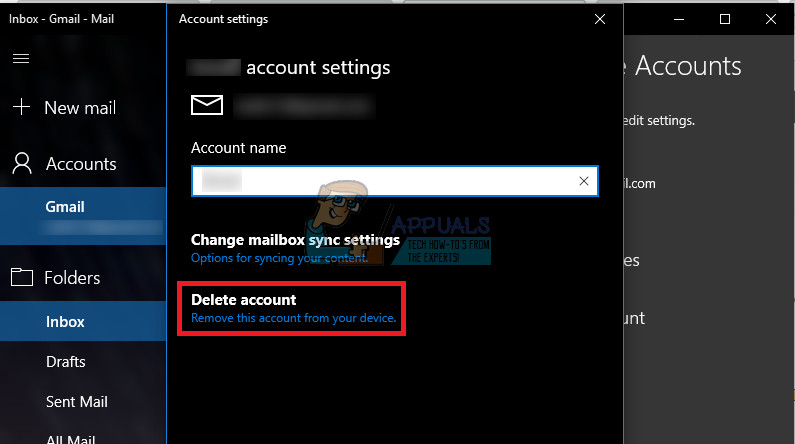 - When its window opens, click on the Delete account option in order to remove this account from the Mail app.