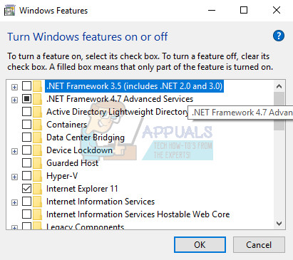 - If the checkbox next to .NET Framework 4.x is not enabled, enable it by clicking the box. Click OK to close the Windows Feature window and reboot the computer.