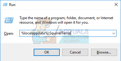 - After the error has appeared, either click the Start button or the search button next to it and type “Run” or use the Windows Key + R key combination in order to bring up the Run dialog box. Type in “%localappdata%\SquirrelTemp” and click Enter.