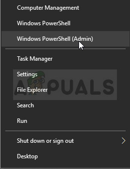 - Open the PowerShell utility by right-clicking the Start menu button and clicking on the Windows PowerShell (Admin) option at the context menu.