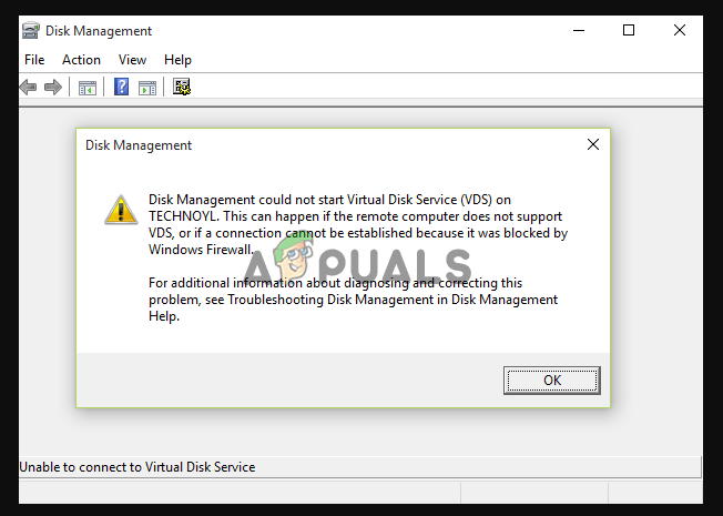 Disk Management could not start Virtual Disk Service (VDS) error occurs when users are trying to partition or rename drivers on their Windows computers. The same error message has a variation which is ‘Unable to connect to Virtual Disk Service’. There are a number of reasons why you get this error but the common cause is Firewall or your security programs blocking and interfering with the connection between the remote computer and Virtual Disk Service.