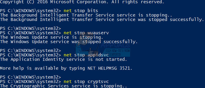 - Stop three services as following: BITS (Background Intelligent Transfer Service), Windows Update service and the Cryptographic service. You need to type the following commands at a Command Prompt.