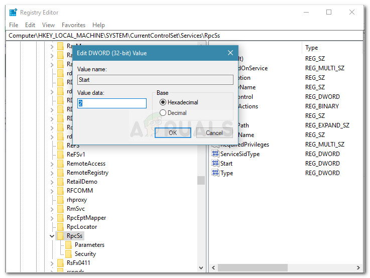 - With the RpcSs registry key selected, move over to the right pane and double-click on the Start value.