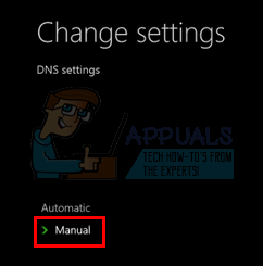 - Once in DNS settings, use your controls and select “Manual”. Your DNS settings will probably be automatic at this point but we will try setting them with a manual address.