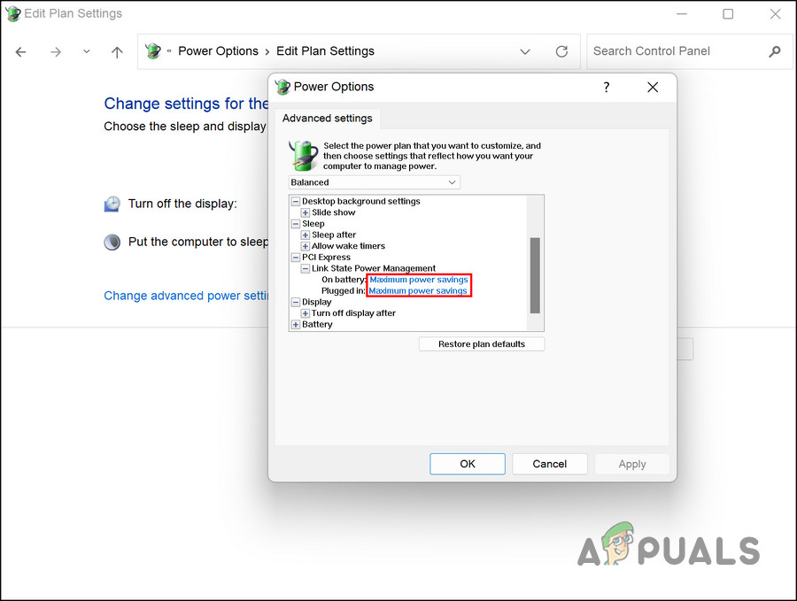 Modify the advanced power settings in Windows - Expand PCI Express settings and then double-click on Link State Power Management.