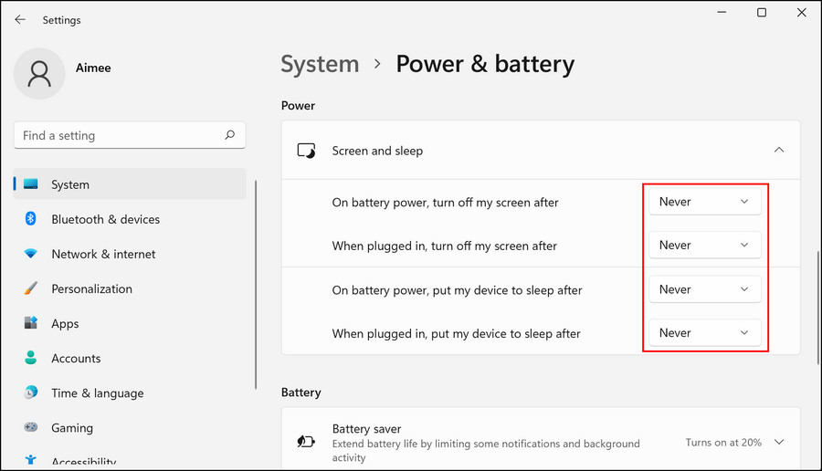 Launch Power & battery settings - Expand the dropdown menus for Screen and sleep and choose Never.