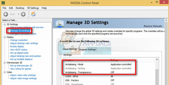 - Click on “Manage 3D settings” using the left navigation pane. Now turn each antialiasing settings to “Off”. In this case, the mode is set to ‘Application-controller’. Change that to “Off” to override all external settings.