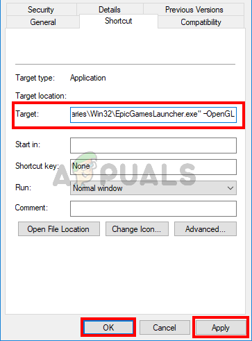 - Now locate the Target field (make sure the Shortcut tab is selected) and add “-OpenGL” (without quotes) at the end of the target field. Type “-OpenGL” (without quotes). The contents of the Target field should look like this “C:\Program Files (x86)\Epic Games\Launcher\Portal\Binaries\Win32\EpicGamesLauncher.exe” –OpenGL