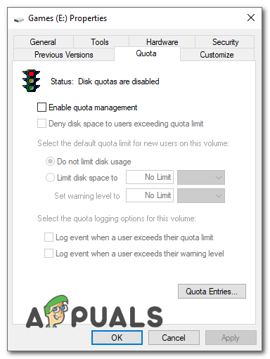 Opening Drive Properties - Now head over to “Quota” settings, make sure “Enable Quota Management” is disabled.