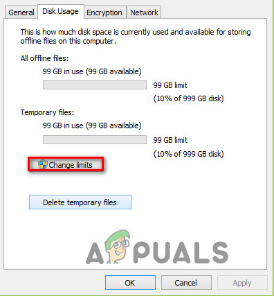 - Then, from the Offline files window, go to the Disk Usage tab and click the Change limits button. When prompted by the UAC(User Account Control), click Yes to grant administrative privileges.