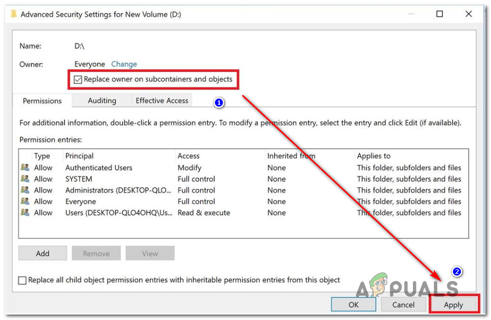 Accessing the Auditing tab of the affected drive - Under the Auditing Entry for the affected volume, select Everyone as Principal, then go to the Basic permission section and check the box associated with Full control. Finally, click Ok then Apply to save the changes.