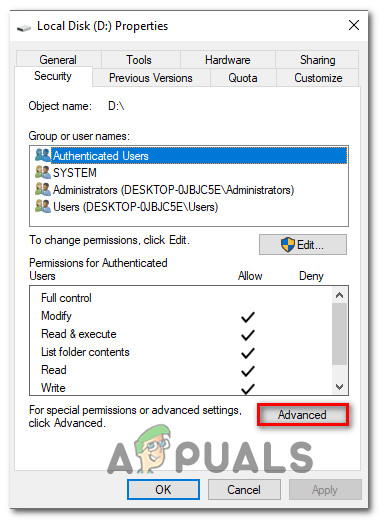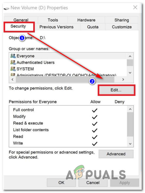 Accessing the Properties screen of the affected drive - Inside the properties screen, go to the Security tab and click the Edit button (near To change permissions, click Edit).