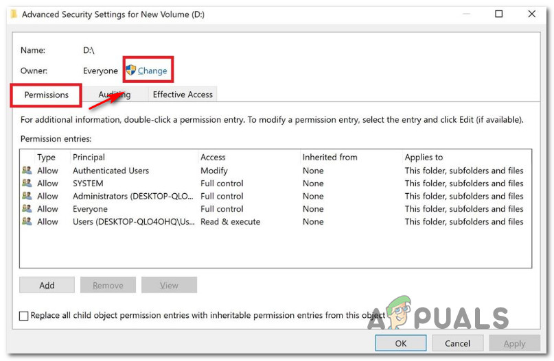Accessing the special permissions menu of the affected drive - From the Advanced Security Settings window, go to the Permissions tab and click on Change.