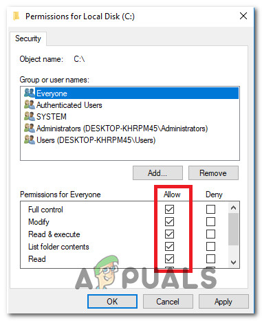 Adding the Everyone group to the permissions for the volume drive - Once you return to the Permissions window, select the Everyone group and put all checkmarks to the allow box under Permissions for Everyone.