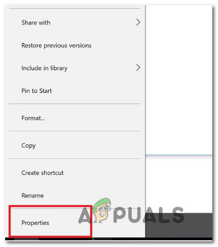 - Inside File Explorer, right-click on the drive letter that you’re encountering the issue with and choose Properties.