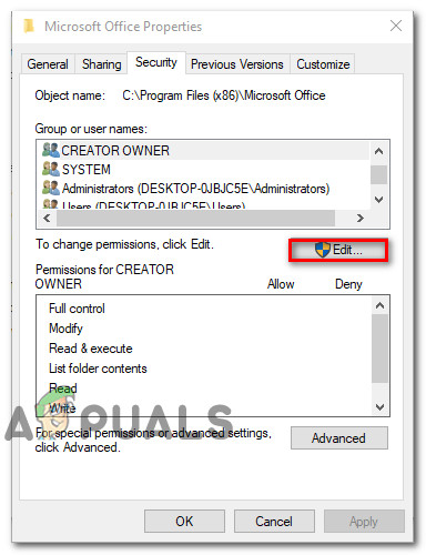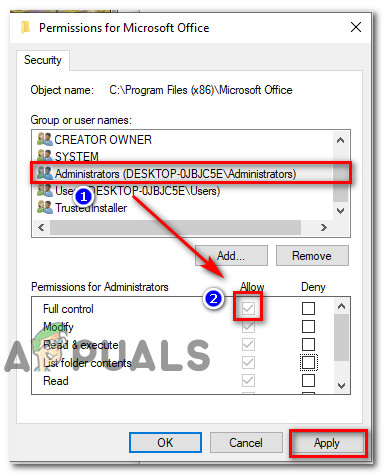 Accessing the permission menu of the folder - In the newly appeared dialog box, select the Administrators Group (under Group or user names) and then ensure that the Full Control box is checked (under Permissions for Administrators). Then, select the Users group and grant them Full Control (just as you did with the Administrators group) and hit Apply to save the changes.