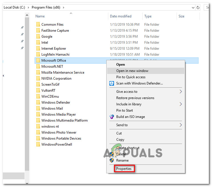 - Use File Explorer to navigate to the location of the Folder responsible for the error. For example, let’s say that we’re trying to install Microsoft Word and the error points towards the Microsoft Office folder. In this case, we’ll navigate to C:\Program Files (x86), right-click on Microsoft Office and choose Properties.