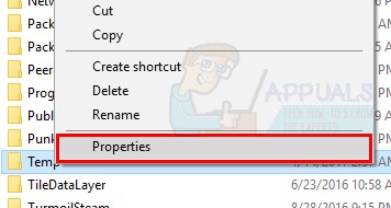 in the address bar located in the middle top of File Explorer and press Enter. - Locate the Temp Folder and right-click on it then select Properties.