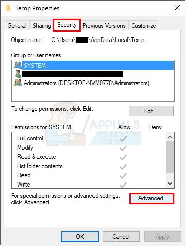Open Properties of Temp Folder - Click the Security tab and then click Advanced.