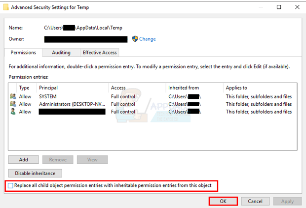 Check the Option of “Replace all child object permissions with inheritable permissions from this object” - Now select any entry that isn’t inherited from C:\Users\[Username]\ folder and click Remove.