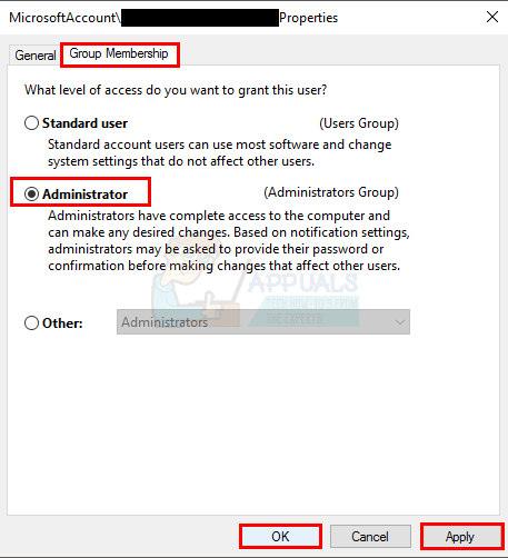 - Click the Administrator and click Apply. Then click OK.